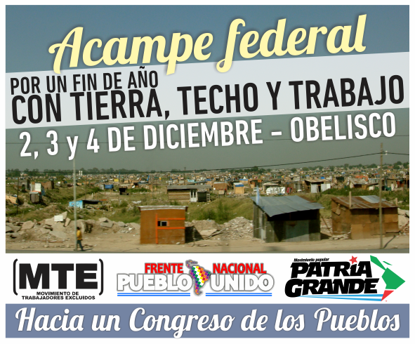 El 2, 3 y 4 de diciembre realizaremos el Primer Acampe Federal de las Luchas en el Obelisco. Nos reuniremos los y las protagonistas de las luchas populares a lo largo y ancho del país durante tres días para debatir sobre los que desafíos que tenemos por delante con el objetivo de construir la unidad de los y las de abajo. Por un fin de año con Tierra, Techo y Trabajo.