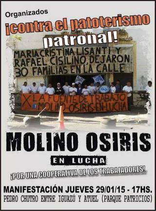 El pasado lunes 26, pasadas las 20 hs., los trabajadores de Molino Osiris sufrieron el ataque y amedrentamiento de un grupo de 30 patovicas armados con cuchillos y sevillanas, que sin orden judicial mediante, intentaron desalojar el lugar a pedido de María Cristina Lisanti y Rafael Cisilino, dueños de la fábrica.