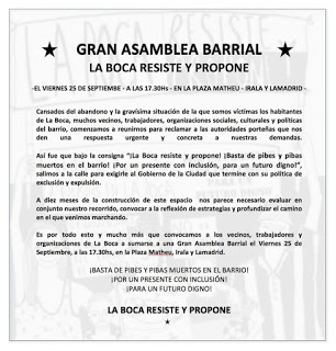 La Boca Resiste y Propone en conjunto con organizaciones sociales, culturales y políticas, convocan a una asamblea vecinal este viernes a las 17:30 en la Plaza Matheu (Irala y Lamadrid). Entre otros temas se discutirá la problemática de la vivienda. En el programa Rompé el Cerco Informativo nos comunicamos con Pablo Rodríguez, integrante de La Boca Resiste y Propone que llama a los vecinos a participar y unirse en resistencia a las políticas excluyentes del Gobierno de la Ciudad Autónoma de Buenos Aires, que buscan transformar La Boca en un barrio de ricos y expulsar a los vecinos mediante los incendios premeditados y los desalojos.