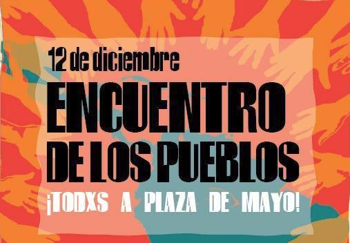 [Resumen Latinoamericano / 10 de diciembre de 2015] El 12 de diciembre, dos días después de la asunción del nuevo gobierno, un conjunto de más de 100 organizaciones populares, colectivos, comunidades de pueblos originarios y diversas expresiones del campo popular nos reuniremos en Plaza de Mayo para el 1er Encuentro de los Pueblos. Durante todo el día nos reuniremos para debatir y constituir un programa popular para la vida digna, que contenga la diversidad de pueblos y culturas.Llegarán de todas las provincias para encontrarnos en Plaza de Mayo y decirle al Gobierno que asume cuál es el piso que no toleraremos que avasallen y cuál es el programa por el que saldremos a ocupar las calles cada vez que nuestras voces no sean escuchadas.
