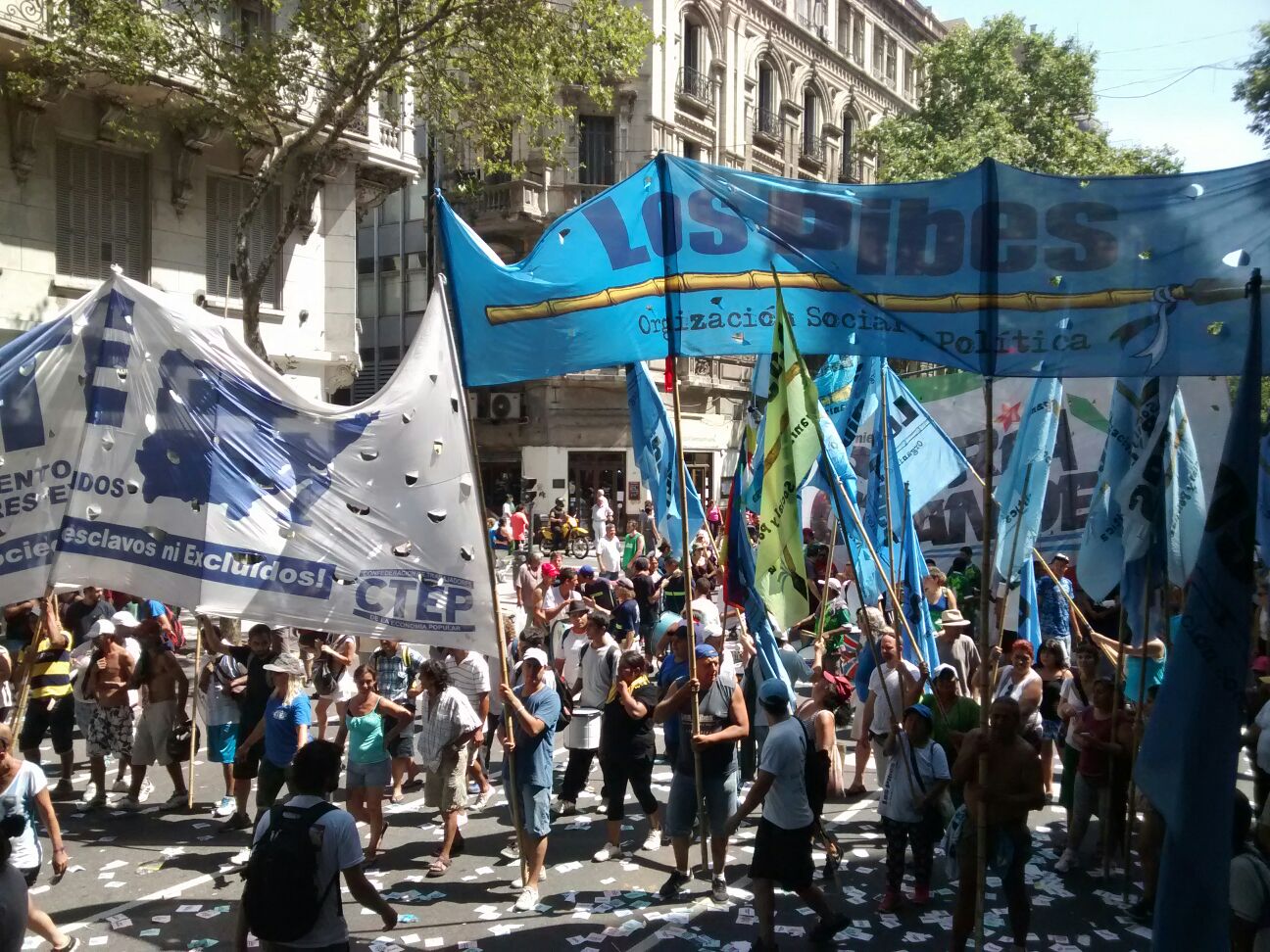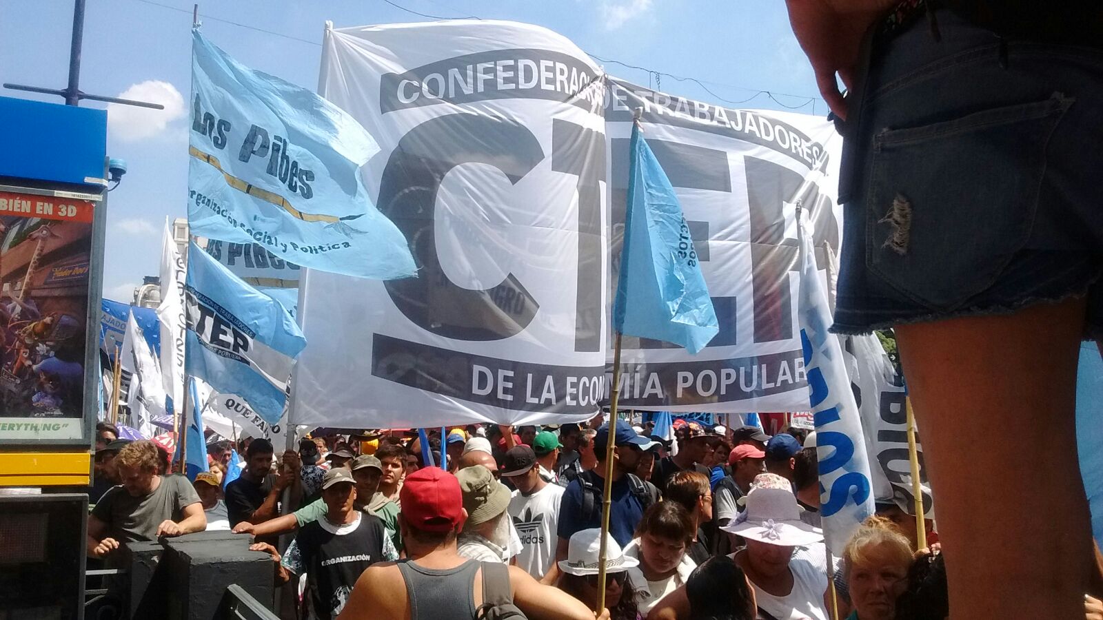 Entre las columnas, la idea de la unidad se hacía visible en la fuerte presencia de la CTEP que marchaba con la consigna del Papa Francisco a la cabeza, «Tierra, Techo y Trabajo«. Su Secretario General, Esteban Gringo Castro, declaró para la FMR: «hay una sola clase trabajadora. Los grupos dominantes lograron fragmentarnos. Pero nosotros vamos a luchas en unidad para romper esa fragmentación». En el mismo sentido se expresó Jacqueline Flores, del Movimiento de Trabajadores Excluidos, que marchaba con sus compañeros trabajadores cartoneros en solidaridad con los estatales: «Hoy acá en la calle está el trabajador en blanco, el precarizado, el tercerizado, en negro, el de la economía popular. Porque todos entendemos que ningún gobierno nos puede faltar el respeto. Estamos por la dignididad que nos tiene que dar el trabajo y que todos la merecemos».