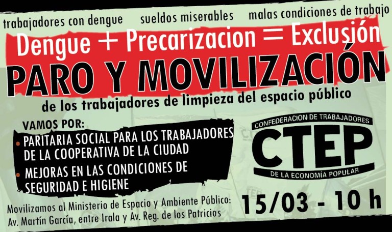 Este martes 15 de marzo, a las 10 de la mañana, los trabajadores organizados en cooperativas que limpiamos los barrios más pobres de la ciudad paramos y movilizamos. Vamos al Ministerio de Espacio y Ambiente Público de la Ciudad de Buenos Aires para pedir por nuestras condiciones de trabajo, pero también para mejorar la limpieza de nuestros barrios. Hoy tenemos numerosos mini basurales en las villas que ponen en peligro nuestra salud y la de nuestros hijos. Nos encontramos con que una parte importante de la plata de trabajadores de limpieza está enferma de dengue. Nos enfermamos por tener que trabajar en malas condiciones, porque no damos abasto, porque necesitamos maquinaria adecuada para erradicar los focos infecciosos de basura que se amontonan en las calles.