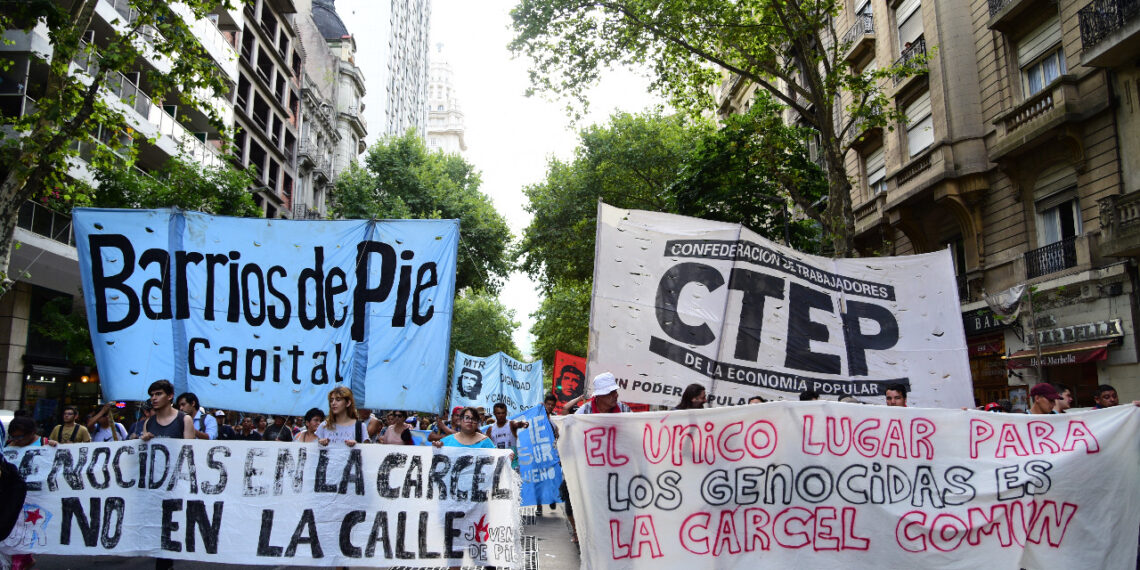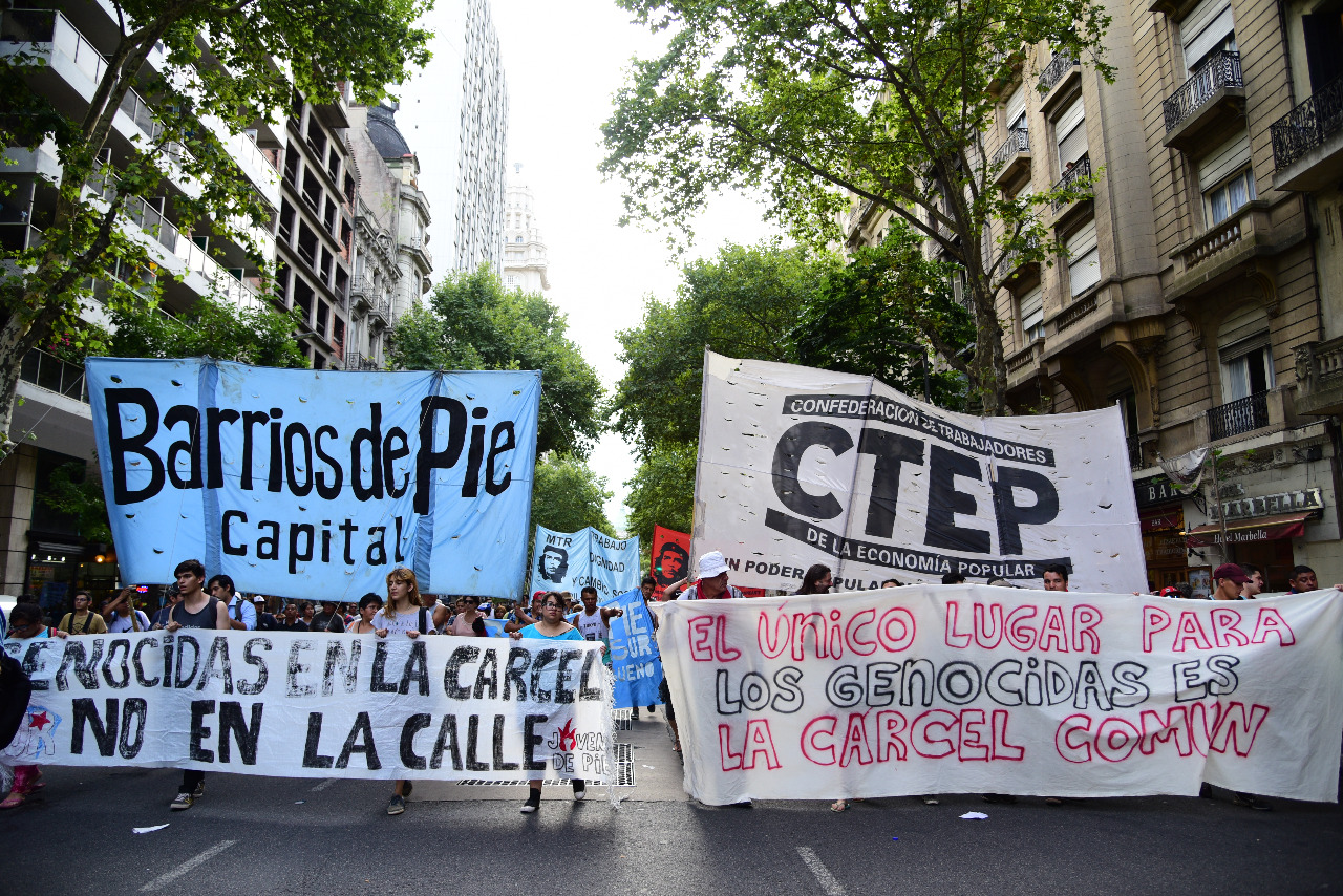 En la masiva movilización la CTEP, Barrios de Pie y la Corriente Clasista y Combativa, marcharon con la consigna “el único lugar para los genocidas es la cárcel común”. No se dejó de lado el pedido de justicia por Santiago Maldonado, ni el rechazo al ascenso del gendarme Emmanuel Echazú, único imputado en la causa por la desaparición y asesinato del joven. Al llegar a Plaza de Mayo se leyó un documento consensuado que denunció la represión e impunidad de las fuerzas de seguridad y al gobierno nacional por criminalizar la protesta y ejecutar su plan de disciplinamiento social para implementar un modelo para pocos, que hasta ahora ha sido fuertemente resistido por el pueblo organizado.