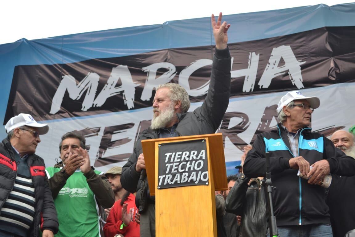 Hugo “Cachorro” Godoy (CTA Autónoma) tomó la palabra y dijo  “Esta marcha federal nace para alimentar la esperanza” y que todos los presentes en el palco se comprometen “a que en el mes de junio realicemos un gran paro nacional con movilización en todo el país”.