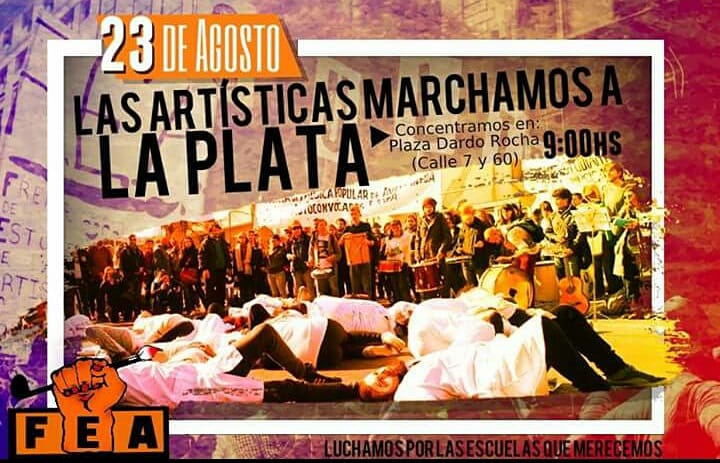 [FM RIACHUELO 22/08/2018] Mañana a partir de las 9:00 hs los terciarios nucleados en el Frente de Estudiantes de Artística (FEA), concentrarán en la Plaza Dardo Rocha de la ciudad de La Plata para exigirle al gobierno de María Eugenia Vidal condiciones dignas de trabajo y cursada, incremento de los módulos para que ningún alumno se quede sin cupo y soluciones estructurales como una ley de financiamiento que destine fondos específicos para el sector.