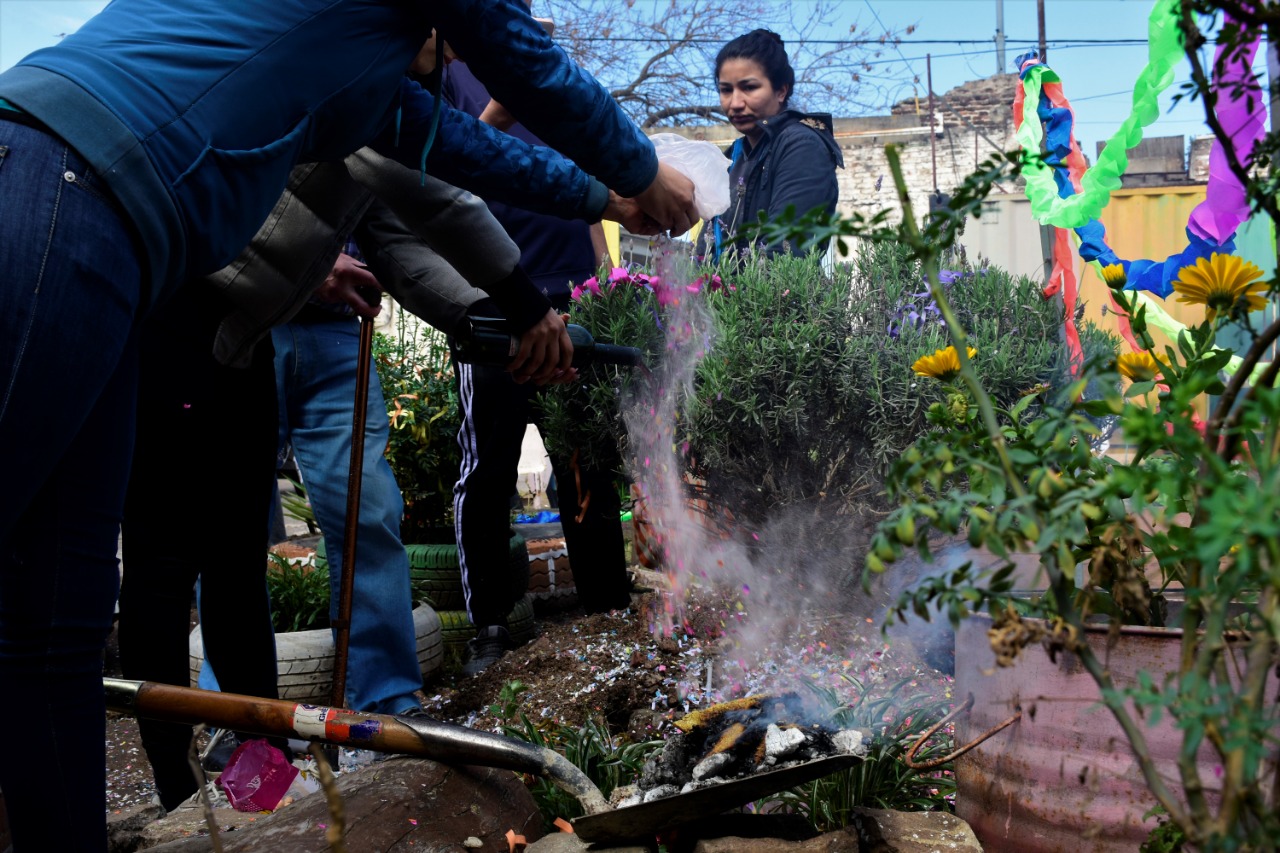 La cita estaba programada para el mediodía, instante preciso en que el sol empezó  a asomar sus rayos de luz para dar comienzo a esta celebración. Vecinos, vecinas, militantes del Movimiento Popular Los Pibes y organizaciones del barrio se acercaron con sus ofrendas para compartir juntos esta ancestral reivindicación a la Pachamama. Como es la costumbre se cavó un pozo donde se le da de comer y beber a la Madre Tierra, el sahumado y la caña con ruda no faltaron en esta ceremonia que mantuvo unida a la comunidad del barrio, fortaleciendo los lazos comunitarios que nuestras barriadas tienen en su ADN.