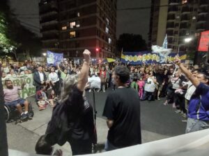 También Mónica Pérez, referente del Movimiento Popular Los Pibes, saludó a la columna: “Hoy los esperamos en esta esquina, en un día muy especial para nosotros, celebramos el cumpleaños de nuestro compañero Martín Oso Cisneros. Pero queríamos saludarlos, recibir esta caravana entendiendo que la unidad, el esfuerzo, el compañerismo, trabajar por los vecinos, trabajar por el territorio en unidad es lo único que nos va a salvar ante la embestida de este gobierno que no se preocupa por los barrios del sur de la ciudad”.
