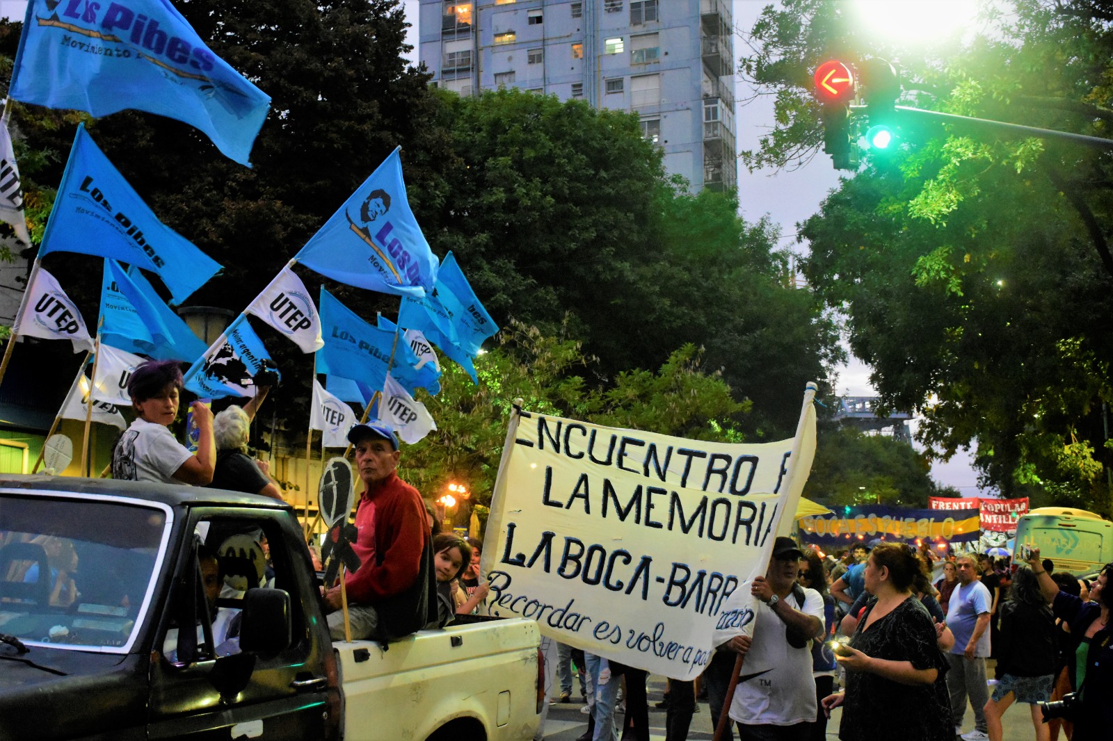 Contó con 4 paradas, la primera fue en la esquina de la Avda. Almirante Brown y Suarez, donde fueron recibidos por la militancia del Movimiento Popular los Pibes. En esta parada el barrio también conmemoró a Martin Oso Cisneros, militante social asesinado por un sicario de la policía en 2004; a David, Emanuel, Ezequiel, Jesús, Belén y Celeste seis hermanos que perdieron su vida en el incendio del Banco Italiano en 2009 y a Nehuen Rodríguez, joven asesinado por la policía en 2014.